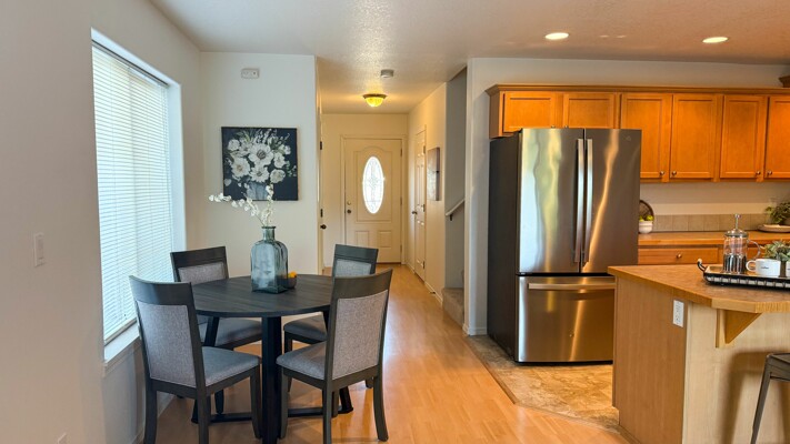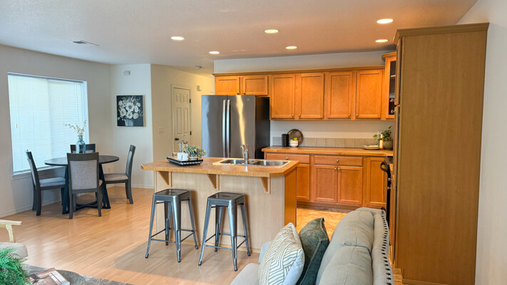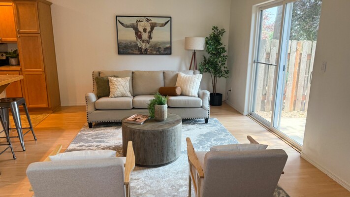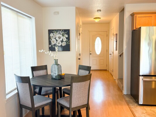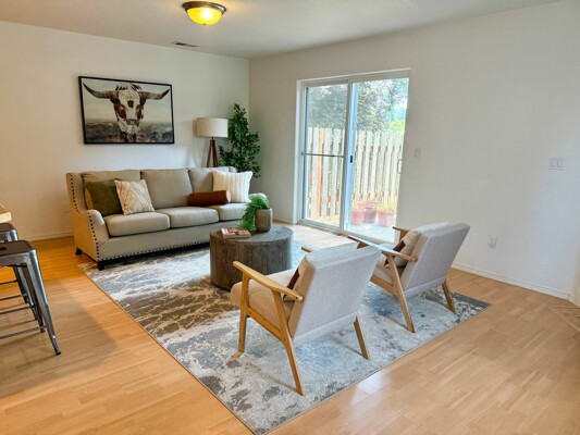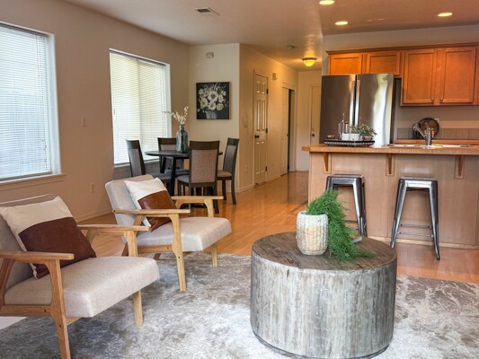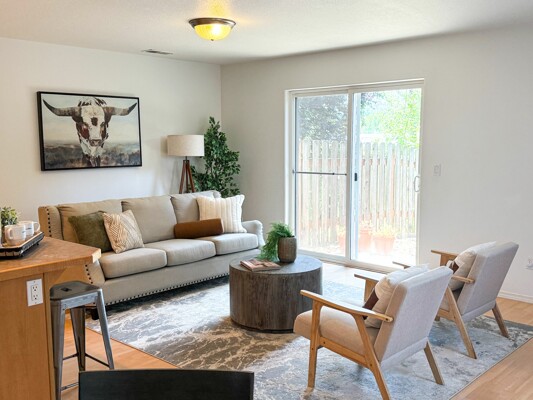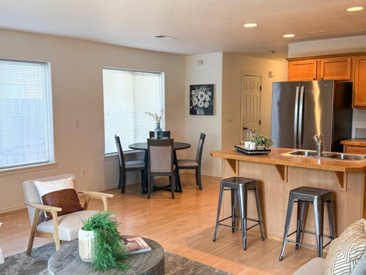 Welcome to this bright and serene duplex-style townhome located backing up to a non-developable green space. Since it is an end unit there are plenty of windows and light flooding the home. This appealing property, built in 2006, offers a modern and spacious living experience with 3 bedrooms, 2.5 bathrooms, and an upstairs loft area, providing ample space for comfortable living. Upon entering, you'll be greeted by an open concept floor plan that seamlessly connects the main living areas. The kitchen which combines both style and functionality, boasts stainless steel appliances, brand new dishwasher and seamless slab countertops with an island perfect for bar stools. Spacious vaulted primary suite with attached bath and walk in closet. Upstairs laundry, washer and dryer are included. AC included. Fully fenced and usable backyard with private patio, great for entertaining and space for raised garden beds to have fresh produce and herbs. The neighborhood itself is set back from Harold Street and offers privacy and a peaceful atmosphere. The HOA maintains the front landscaping, fences, sidewalks, driveways and street.